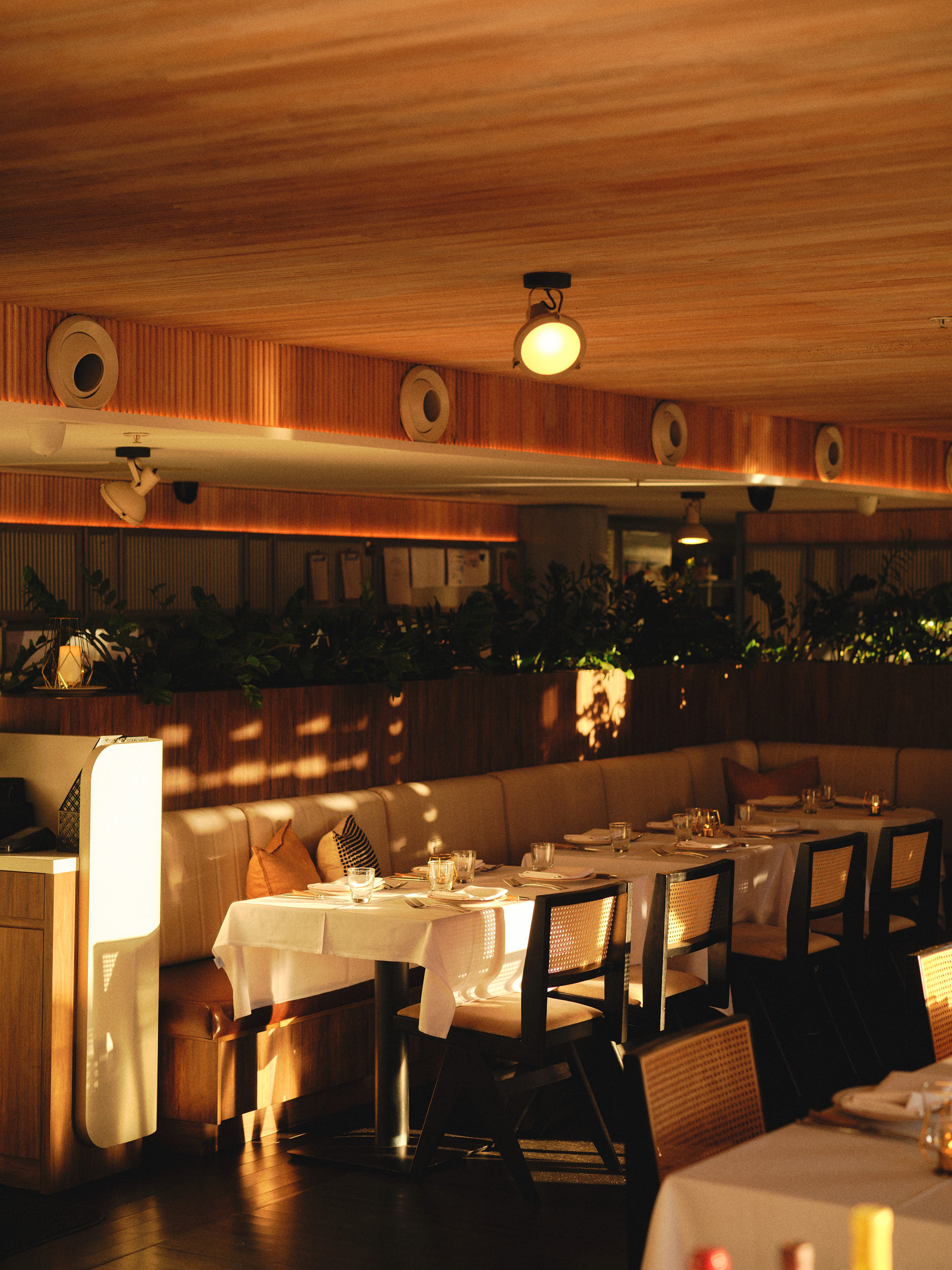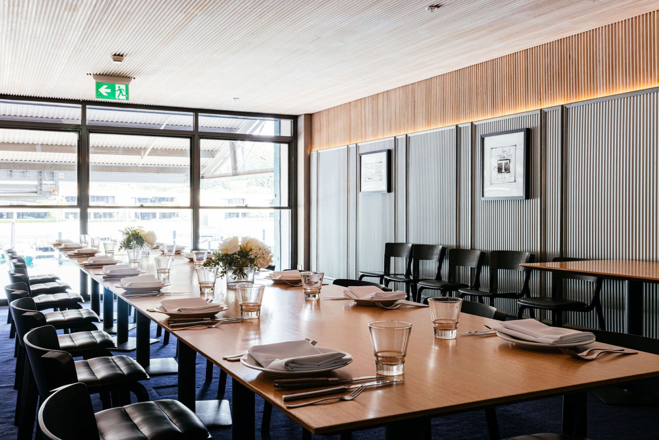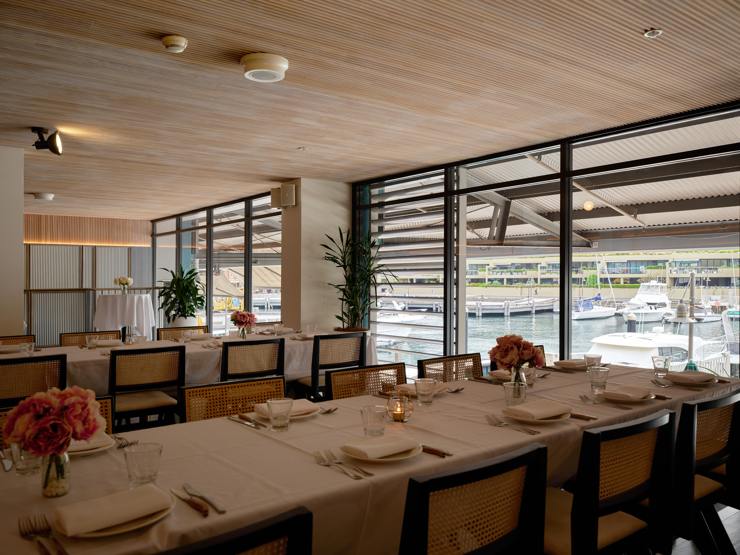 The indoor dining room at Kingsleys Woolloomooloo offers an elegant, contemporary setting with warm timber accents and harbour views, perfect for elevated sit-down events, long lunches and refined celebrations.